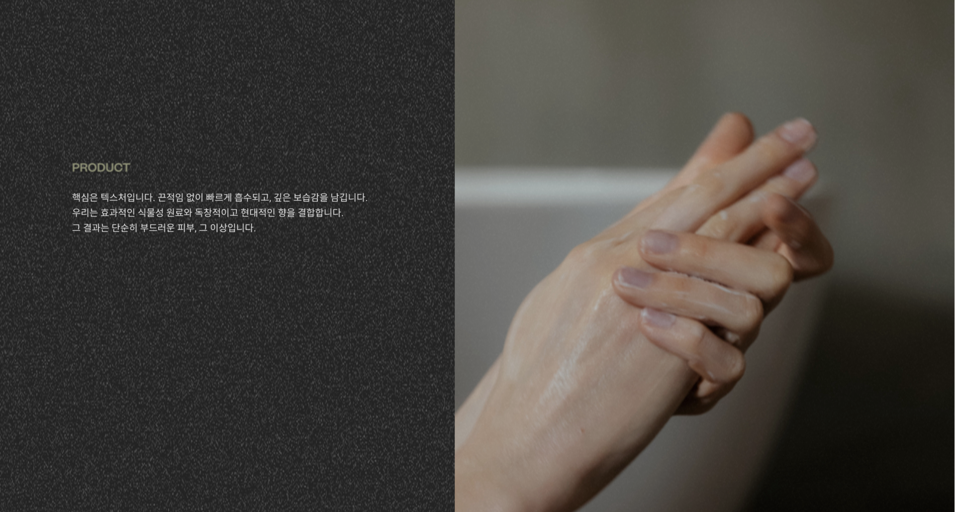 핵심은 텍스처입니다. 끈적임 없이 빠르게 흡수되고, 깊은 보습감을 남깁니다. 우리는 효과적인 식물성 원료와 독창적이고 현대적인 향을 결합합니다.