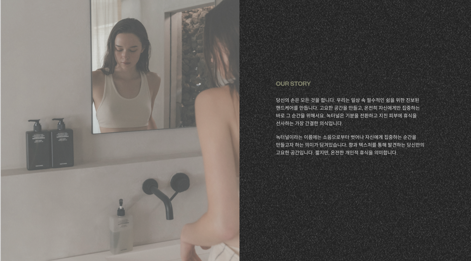 녹터널이라는 이름에는 소음으로부터 벗어나 자신에게 집중하는 순간을 만들고자 하는 의미가 담겨있습니다. 향과 텍스처를 통해 발견하는 당신만의 고요한 공간입니다. 짧지만, 온전한 개인적 휴식을 의미합니다.